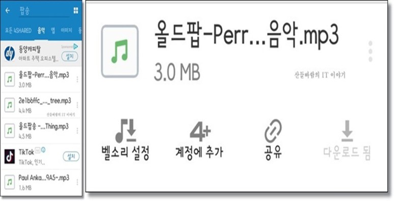 그리고 나서 검색목록에서 나타는 파일중에서 MP3파일인지 확인을 하신후에 우측에 잇는 : 버튼을 클릭해주시고 해당파일을 다운로드 눌러주면 다운로드가 시작되면서 다운로드 완료가 되었다는 메시지까지 뜨게됩니다.