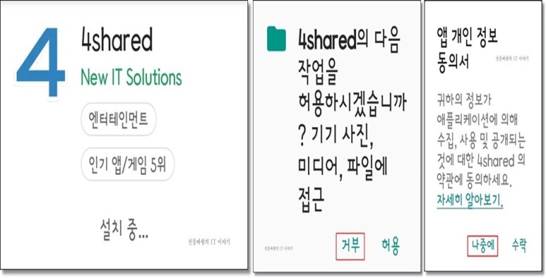그리고 '앱 개인 정보 동의서'에서 귀하의 정보가 애플리케이션에 의해 수집, 사용 및 공개되는 것에 대한 4shared의 약관에 동의하세요.라는 메시지에서 수락이 아닌 나중에를 클릭합니다.
