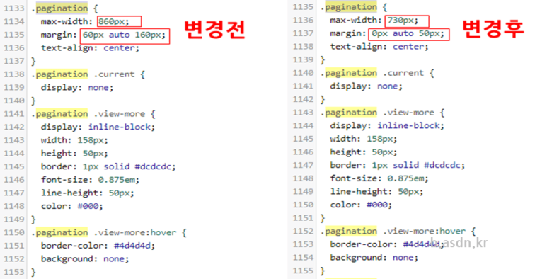 하지만 다른 부분은 전혀 손댈 필요가 없으며 .pagination {부분에서 max-width:860px;라고 된 부분과 margin:60px auto 160px;라고 선언된 부분을 수정하시면 되겠습니다.