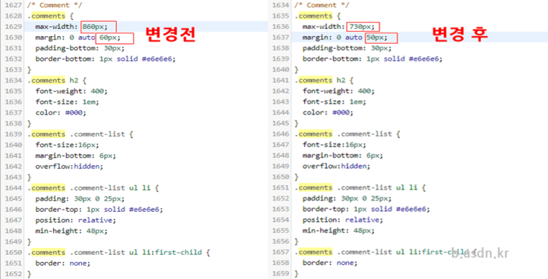 2.comments 이부분에서 제가 수정을 한것은 max-width:860px; 코멘트의 넓이 부분과 margin:auto 60px;라고 되어져 있는 부분입니다.